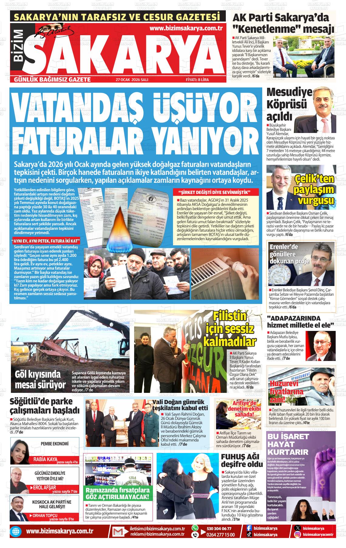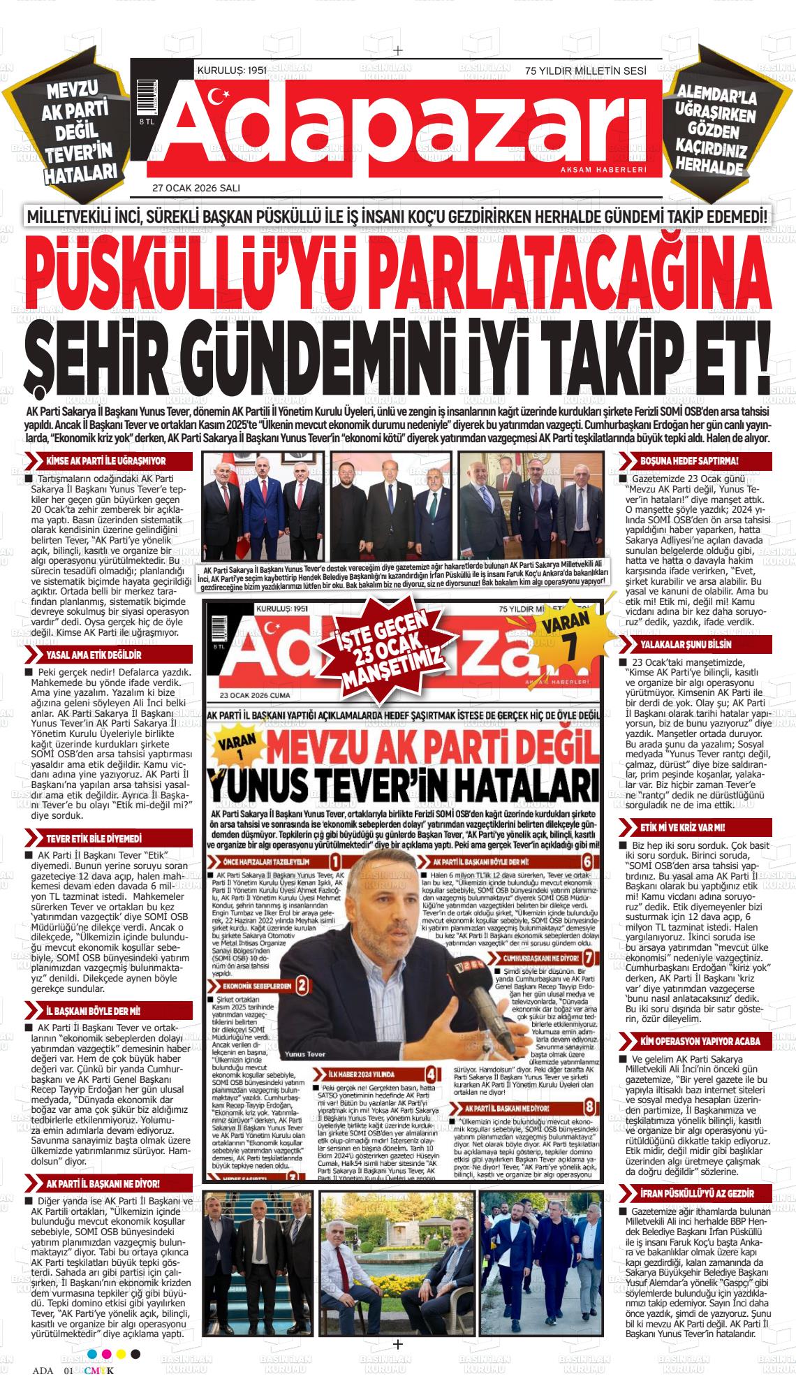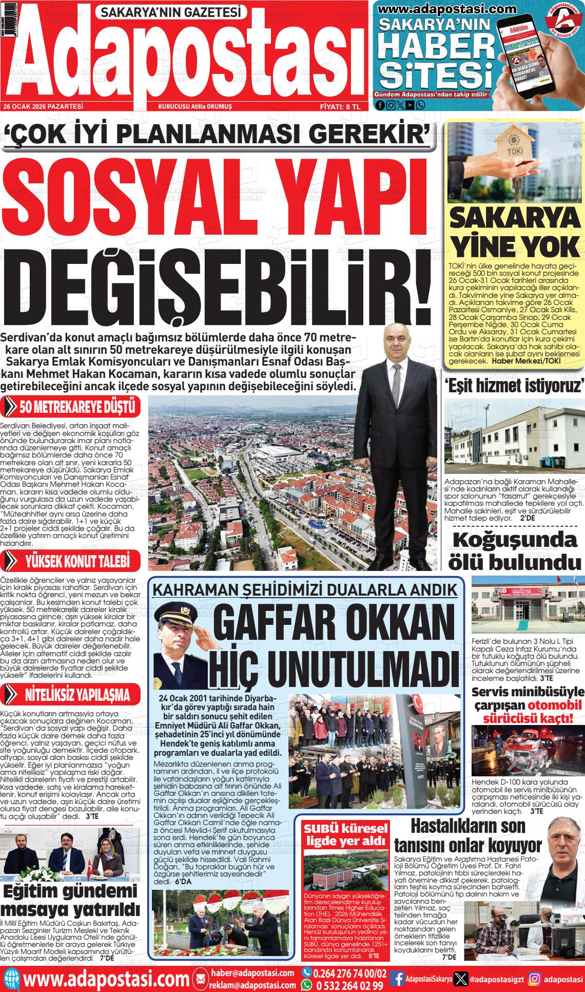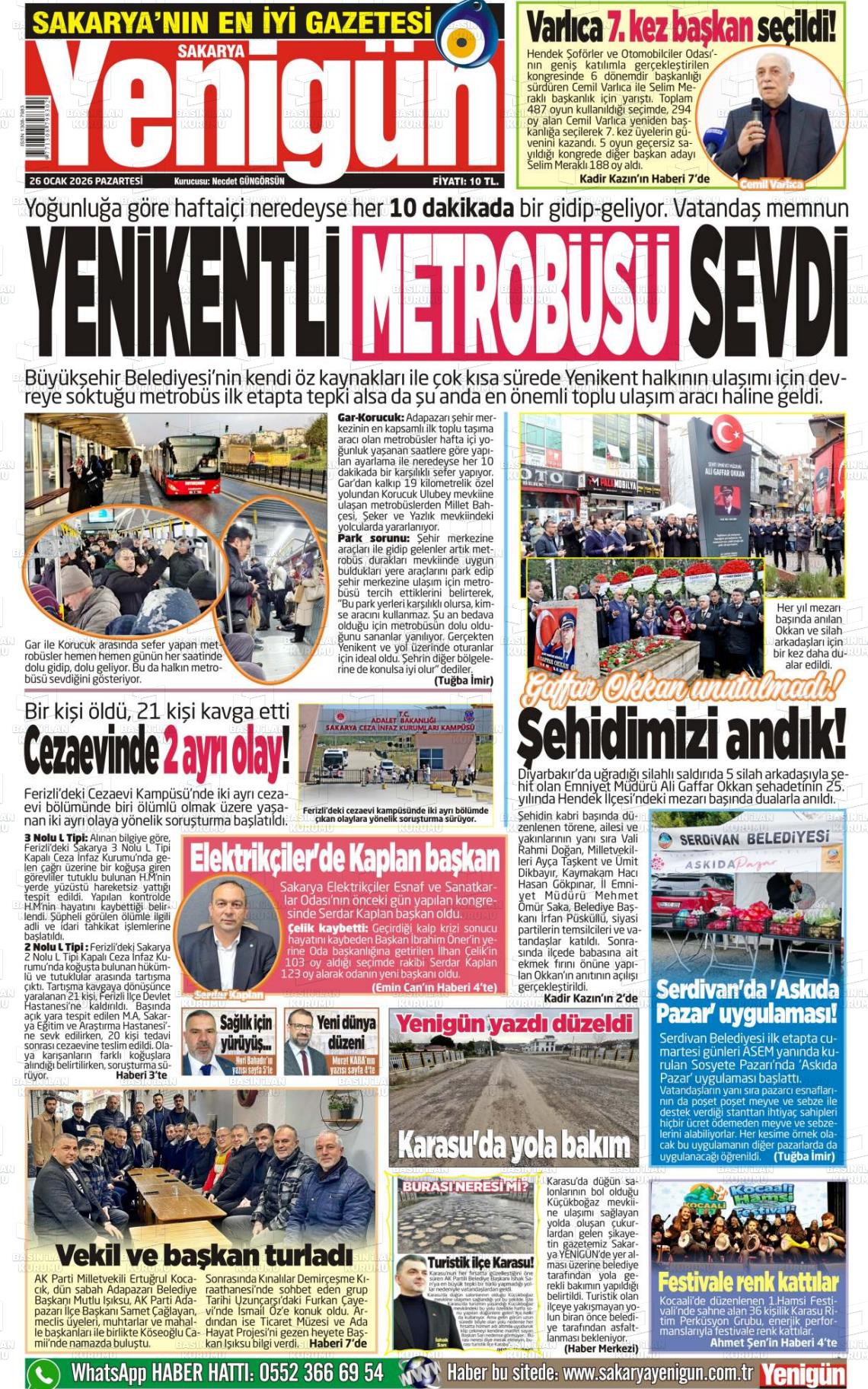 Sakarya Yerel Gazeteleri 26 Ocak 2026, Pazartesi Günü Manşeti