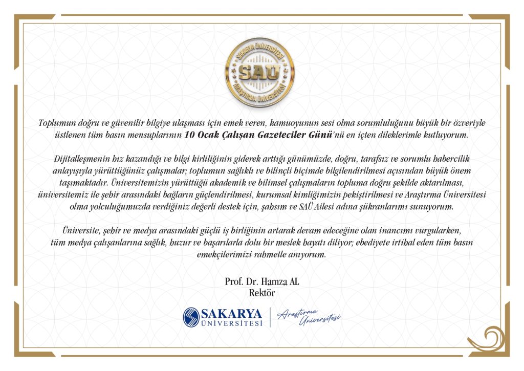 Sakarya Üniversitesi (SAÜ) Rektörü Prof. Dr. Hamza Al, 10 Ocak Çalışan Gazeteciler Günü dolayısıyla bir mesaj yayımlayarak, basın mensuplarının toplumun doğru ve güvenilir bilgiye ulaşmasındaki rolüne dikkat çekti.