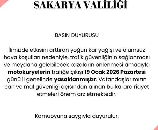 Sakarya Valiliği, kent genelinde etkisini artıran yoğun kar yağışı ve olumsuz hava koşulları sebebiyle motokuryelere yönelik geçici trafik yasağı kararı aldı. Alınan tedbir kapsamında, 19 Ocak 2026 Pazartesi günü il genelinde motokuryelerin trafiğe çıkmasına izin verilmeyecek.