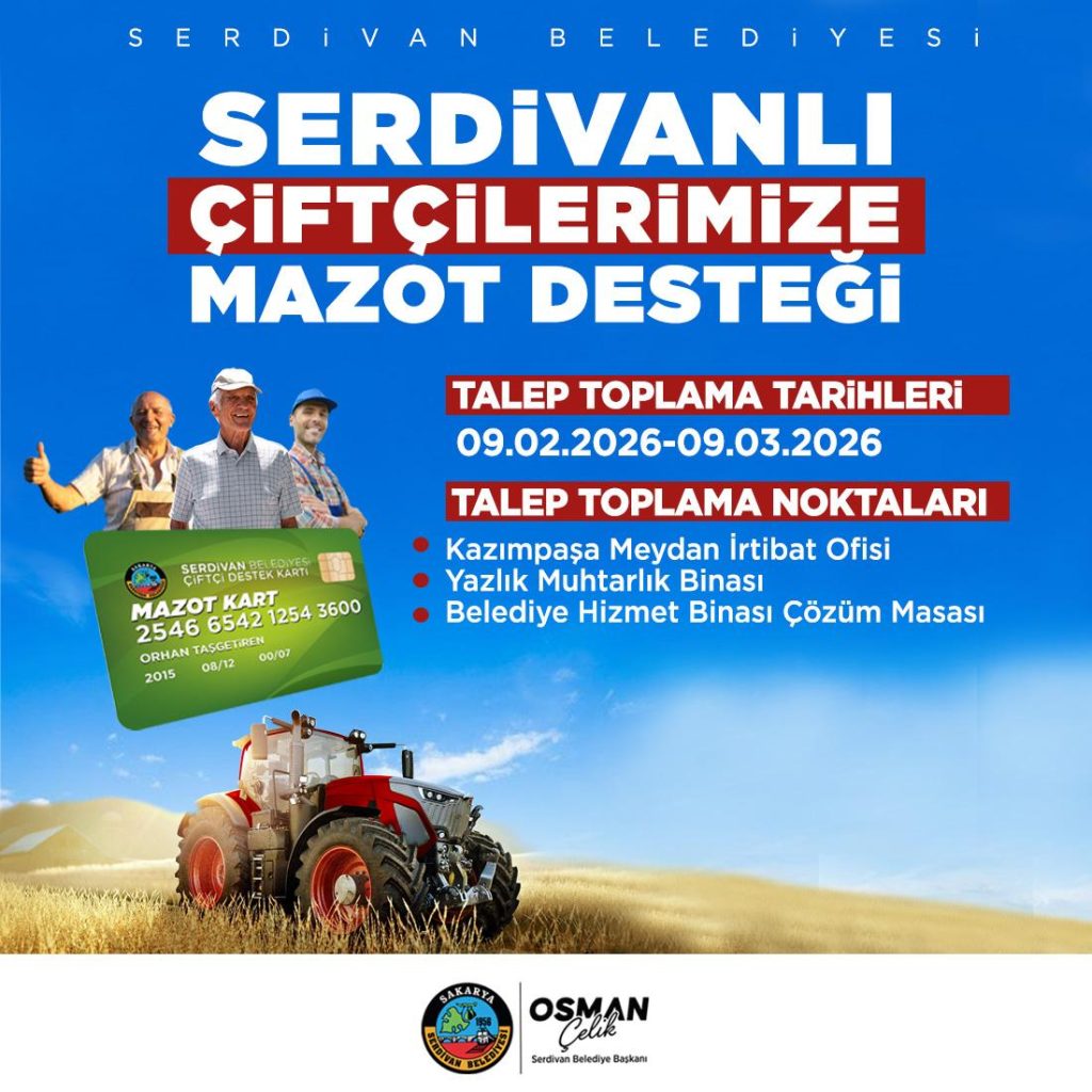 Mazot desteği için talep toplama süreci 9 Şubat 2026 tarihinde başlayacak ve 9 Mart 2026 tarihine kadar devam edecek. Başvurular;