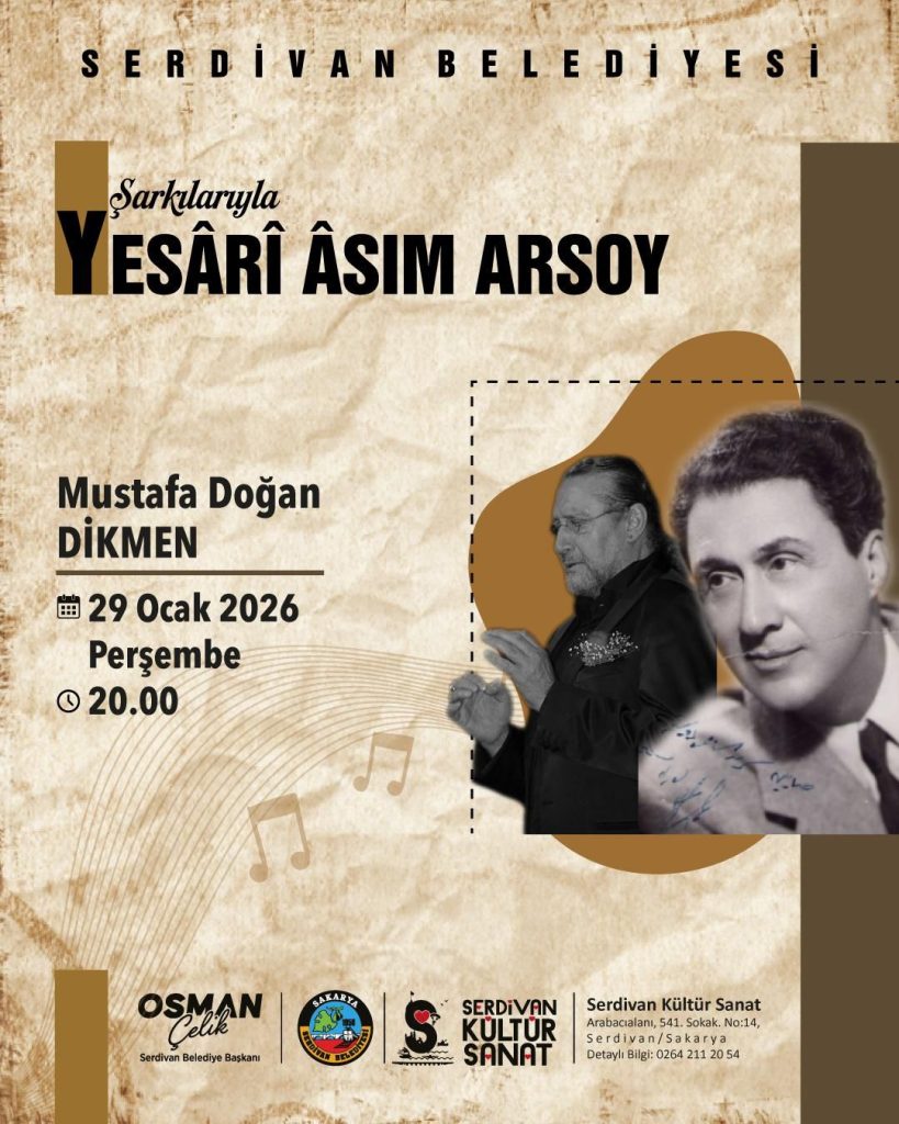 Serdivan Belediyesi, kültür ve sanat etkinlikleri kapsamında Türk müziğine damga vuran isimleri sanatseverlerle buluşturmaya devam ediyor. Yeşilçam döneminin usta bestekârlarından Yesari Asım Arsoy, hafızalara kazınan eserleriyle Serdivan’da yeniden anılacak. Türk Sanat Müziği’nin zarafetini ve derin duygusunu yansıtan besteler, dinleyicileri nostalji dolu bir yolculuğa çıkaracak.